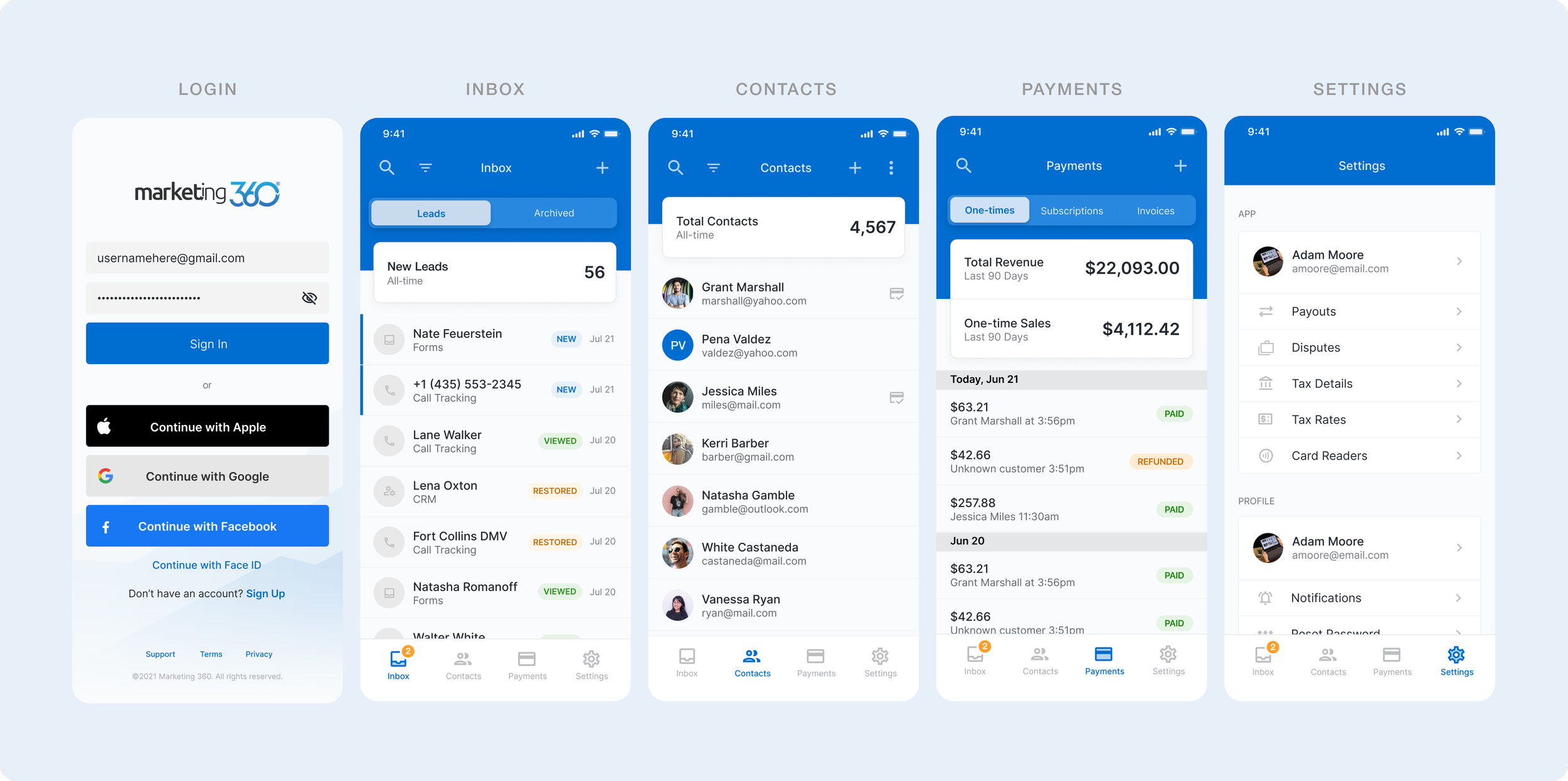 Marketing 360’s CRM & Payments mobile app extends the web platform’s core capabilities into a mobile-first experience, enabling SMBs to create contacts, qualify leads, accept tap-to-pay payments, and issue invoices directly from the field.