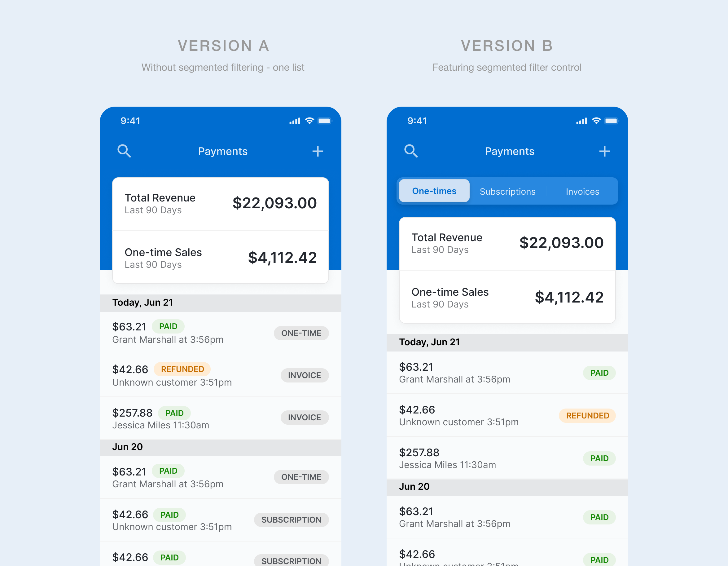 We ran rapid usability validation and moderated user tests to examine viability of core workflows and minimize rework. This included a comparative evaluation of the payments experience, testing a segmented control approach to differentiate payment types (invoices, subscriptions, and one-time payments).